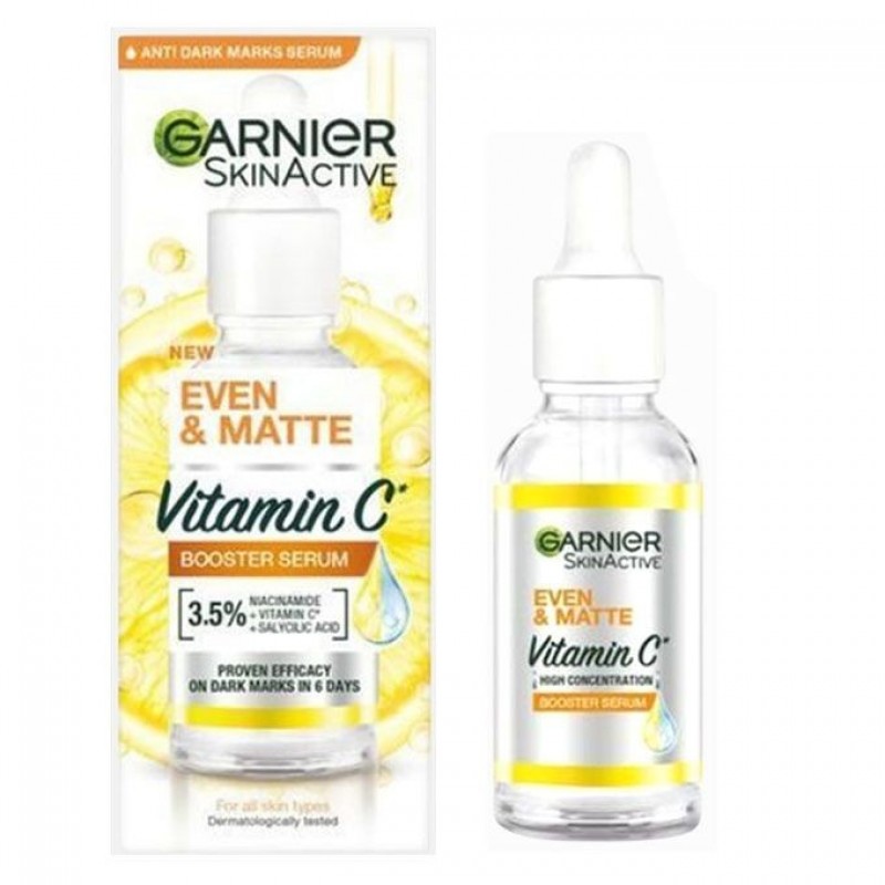 The Garnier Vitamin C Booster Serum is our most concentrated brightening and spot reduction formula in a face serum. Enriched with 3.5% Vitamin C, Niacinamide & Salicylic Acid, this lightweight and non-oily formula instantly penetrates into the skin giving skin an instant glow and reduces 43% of dark marks in just 8 weeks.