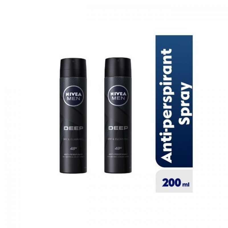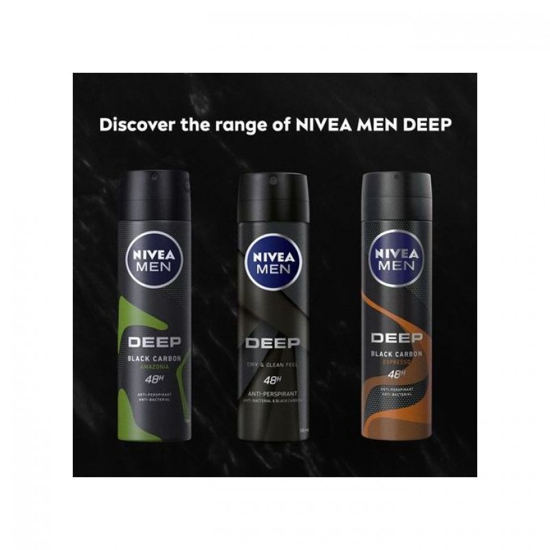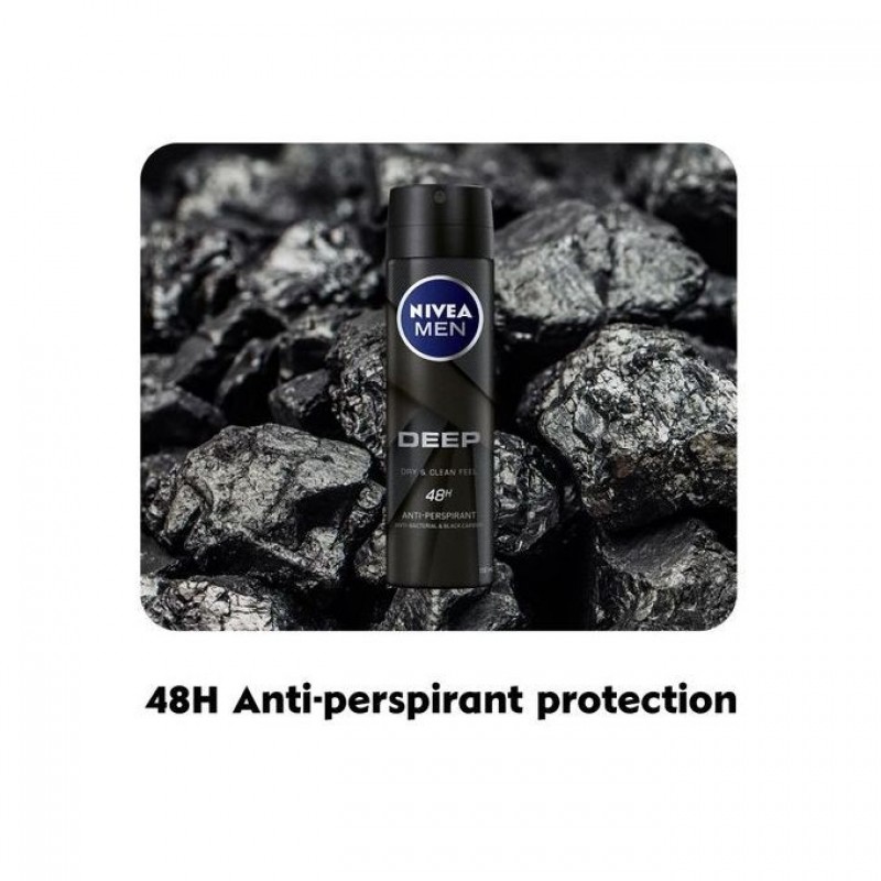 NIVEA MEN DEEP Anti-Perspirant Deodorant Spray with a Black Charcoal formula acts powerfully against bacteria and sweat while eliminating body odour with a modern and masculine Dark Wood Fragrance. The effective formula leaves you feeling as if you have just stepped out of the shower and gives you long-lasting dryness all day.