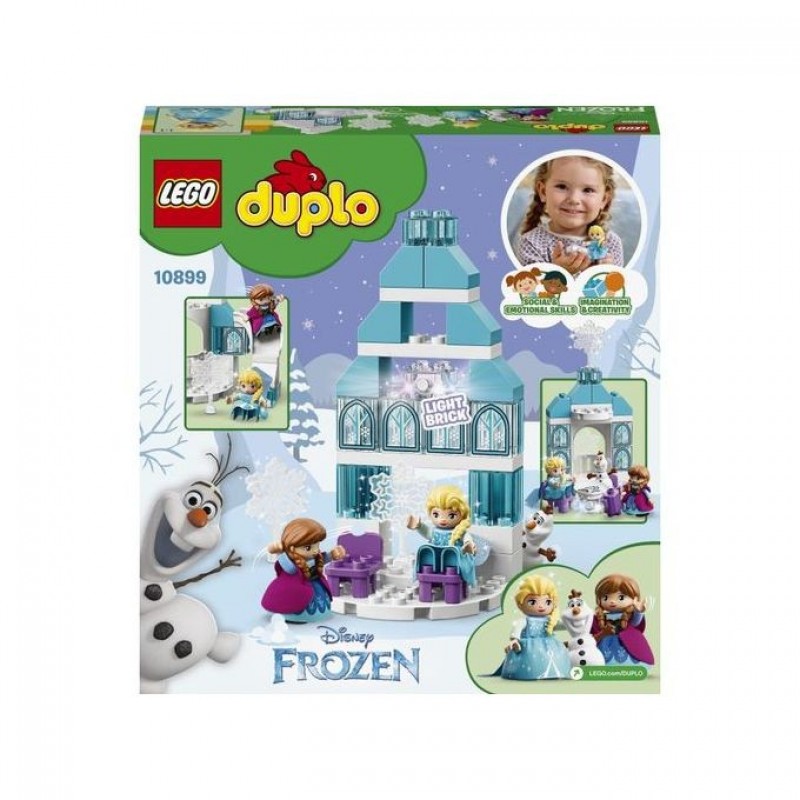 Join Disney’s Anna, Elsa and Olaf at the LEGO® DUPLO® l Disney 10899 Frozen Ice Castle to share imaginative play and precious developmental milestones with your preschooler. As toddlers role-play with their favourite Disney Frozen characters, they improve their language and fine motor skills, and develop social and emotional awareness. Talk about Elsa's relationship with her sister Anna. Enjoy open-ended creative fun with Olaf the snowman. With a multicoloured light brick feature illuminating the castle at the push of a button, you and your little one will have endless enjoyment recreating scenes from Disney’s Frozen movie and dreaming up stories of your own with this sparkling Ice Castle toddler toy building set.